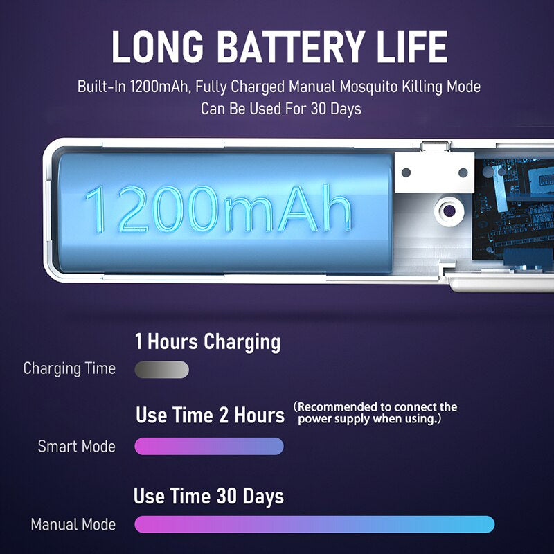 Experience the power of two-in-one functionality with our Mosquito Lamp + Mosquito Swatter. This compact device, operating at a rated power of 2W and a charging voltage of DC5V, utilizes a 1200mAh lithium battery with a phenomenal life span of over 2 years, ensuring you need only charge it once daily for uninterrupted service. The Mosquito Lamp mode provides a 2-hour operation time, while the Swatter mode lasts an impressive 30 days with a usage frequency of 20 times a day. The angle of the swatter is easily adjustable, with a rotatable angle of 90° for no dead angles in mosquito elimination. This product is designed with your safety in mind, incorporating a protection network on the front and back, along with a child safety mechanism that requires the ON1 mode and an electric shock button to operate the swatter. The lamp employs the 360-400 nm band, known to be favored by mosquitoes, guaranteeing efficient mosquito attraction and extermination. The device charges conveniently via USB, with a full recharge achievable in just 2 hours.
