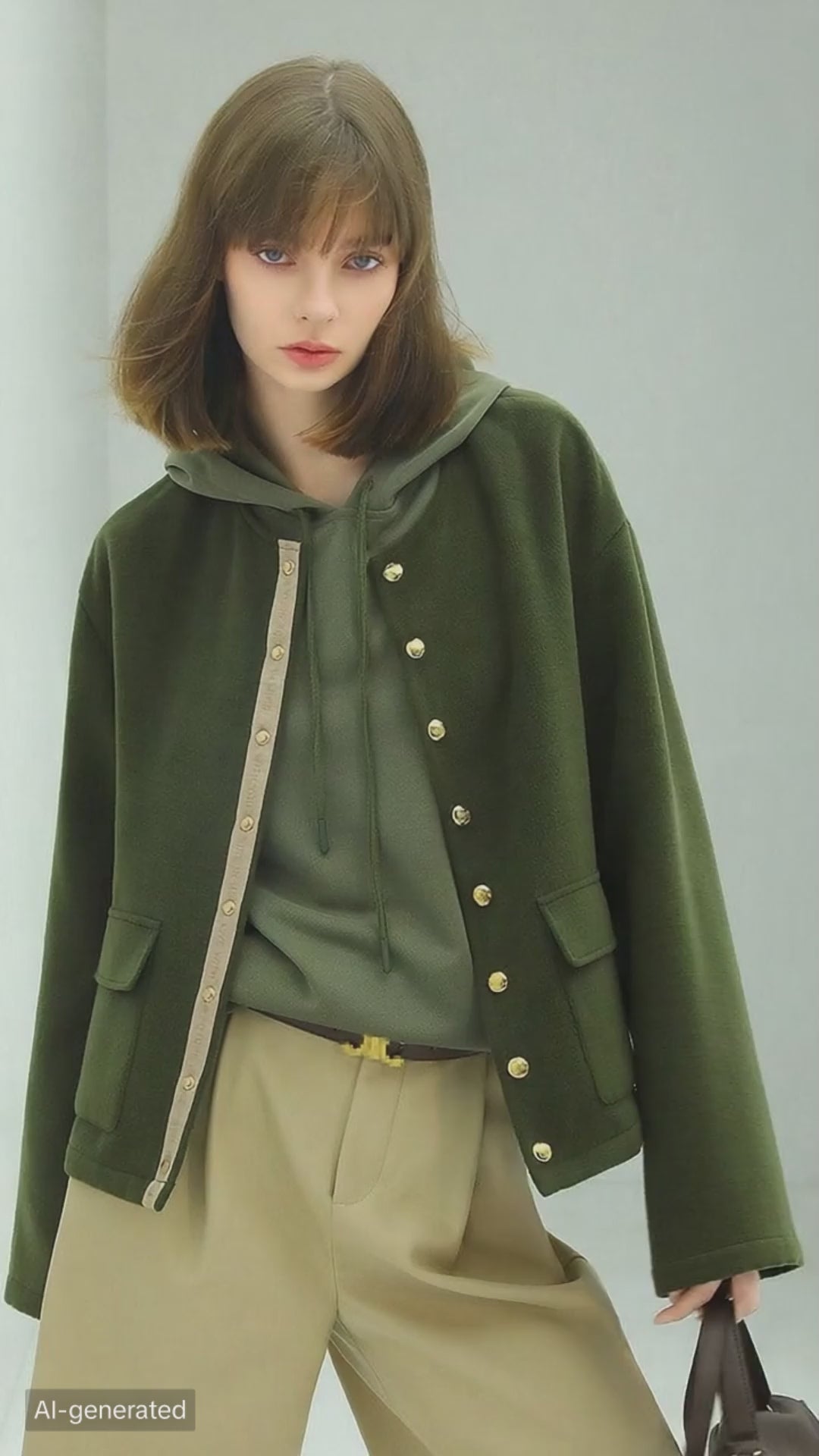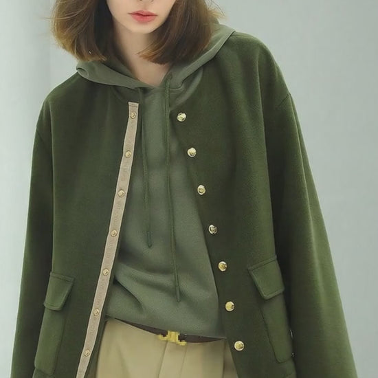 The Green Jacket with Gold Snap Buttons is available in sizes S, M, and L, each tailored for a balanced fit. Size S features a chest width of approximately 52 cm, shoulder width of 44 cm, and a jacket length of 65 cm. Size M measures around 56 cm across the chest, 46 cm at the shoulders, and 67 cm in length. Size L offers a chest width of 60 cm, shoulder width of 48 cm, and a jacket length of 69 cm. These measurements ensure a structured yet comfortable fit, suitable for layering or wearing as a standout piece.