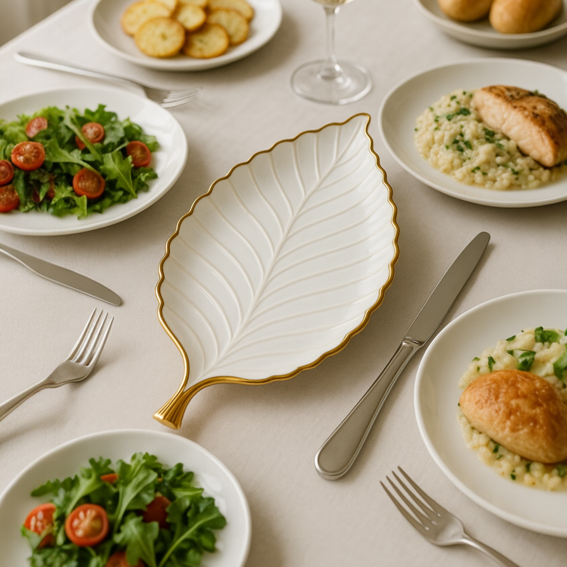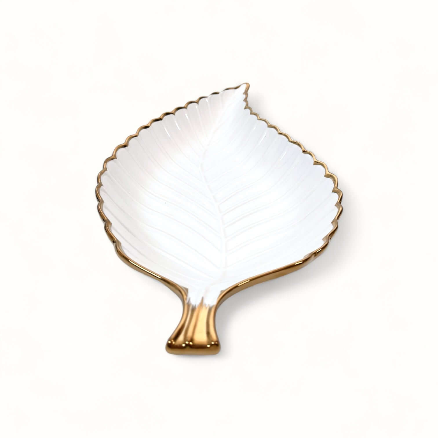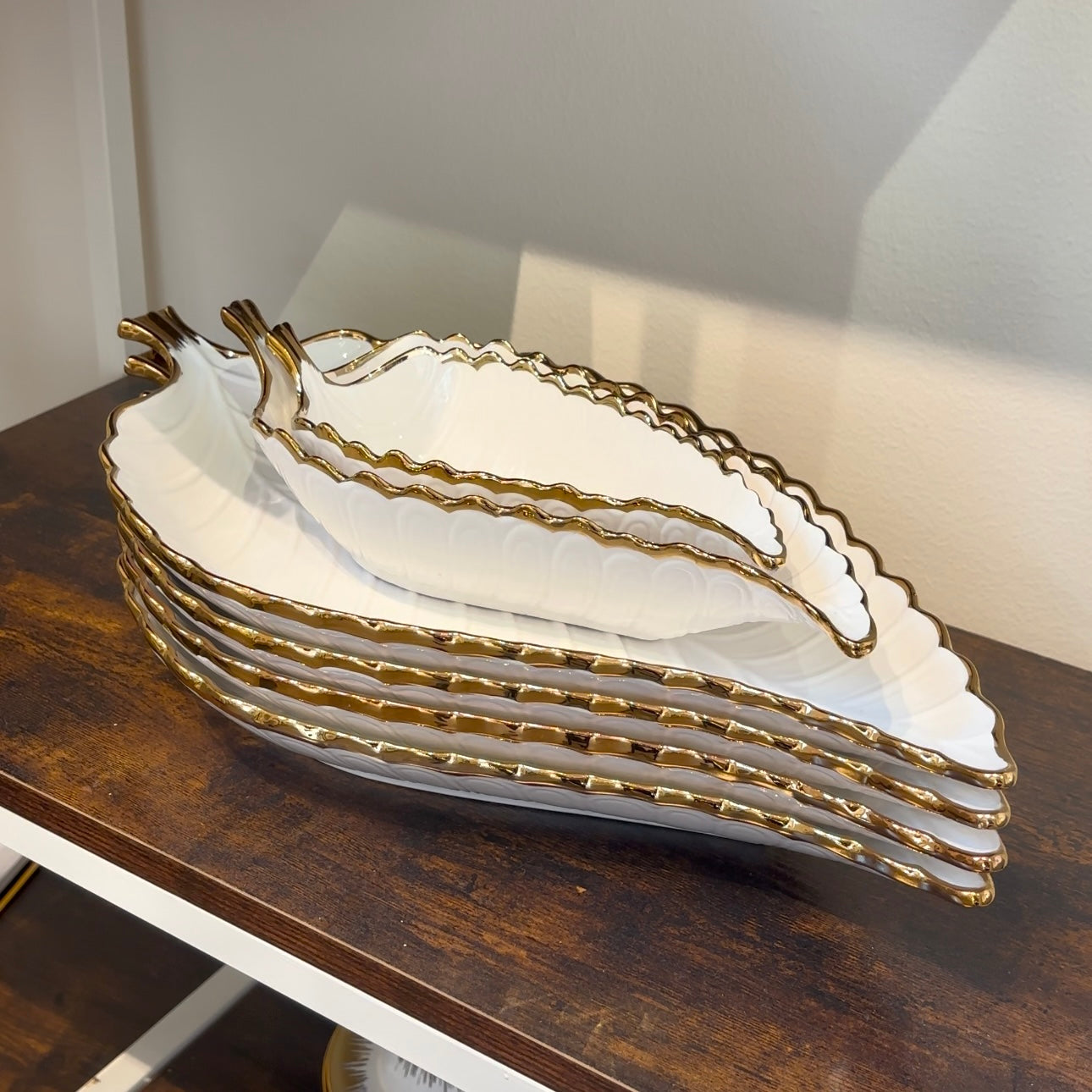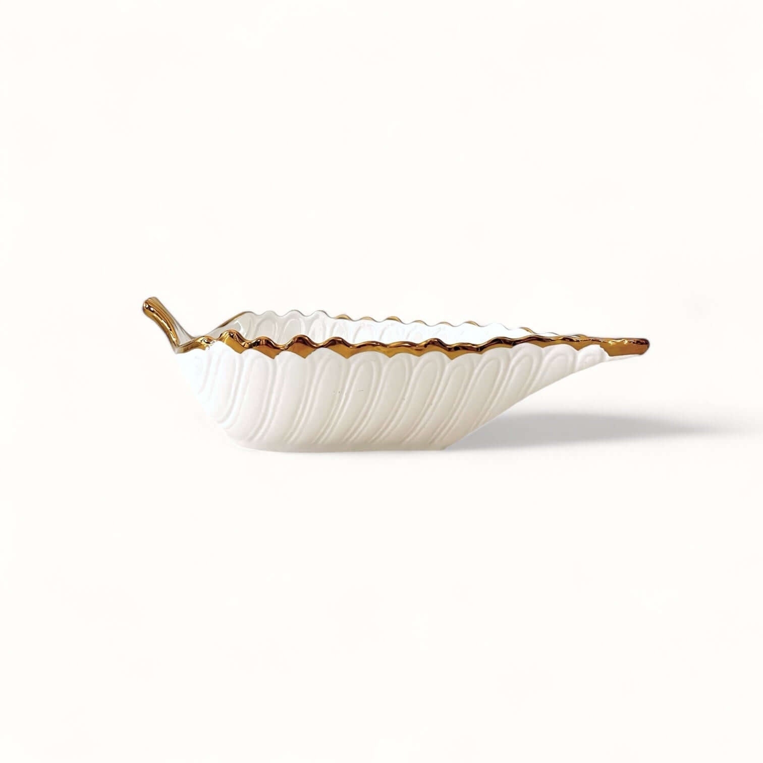 Vår skål i form av ett vitt löv med en strålande guldig kant är den mest eleganta och lyfter fram din mat med stil. Denna skål är inte bara praktisk, den är en smakfull dekoration i sig själv och ger en touch av lyx till din dukning. Gör din matupplevelse extraordinär med vår unika Lövformade skål.