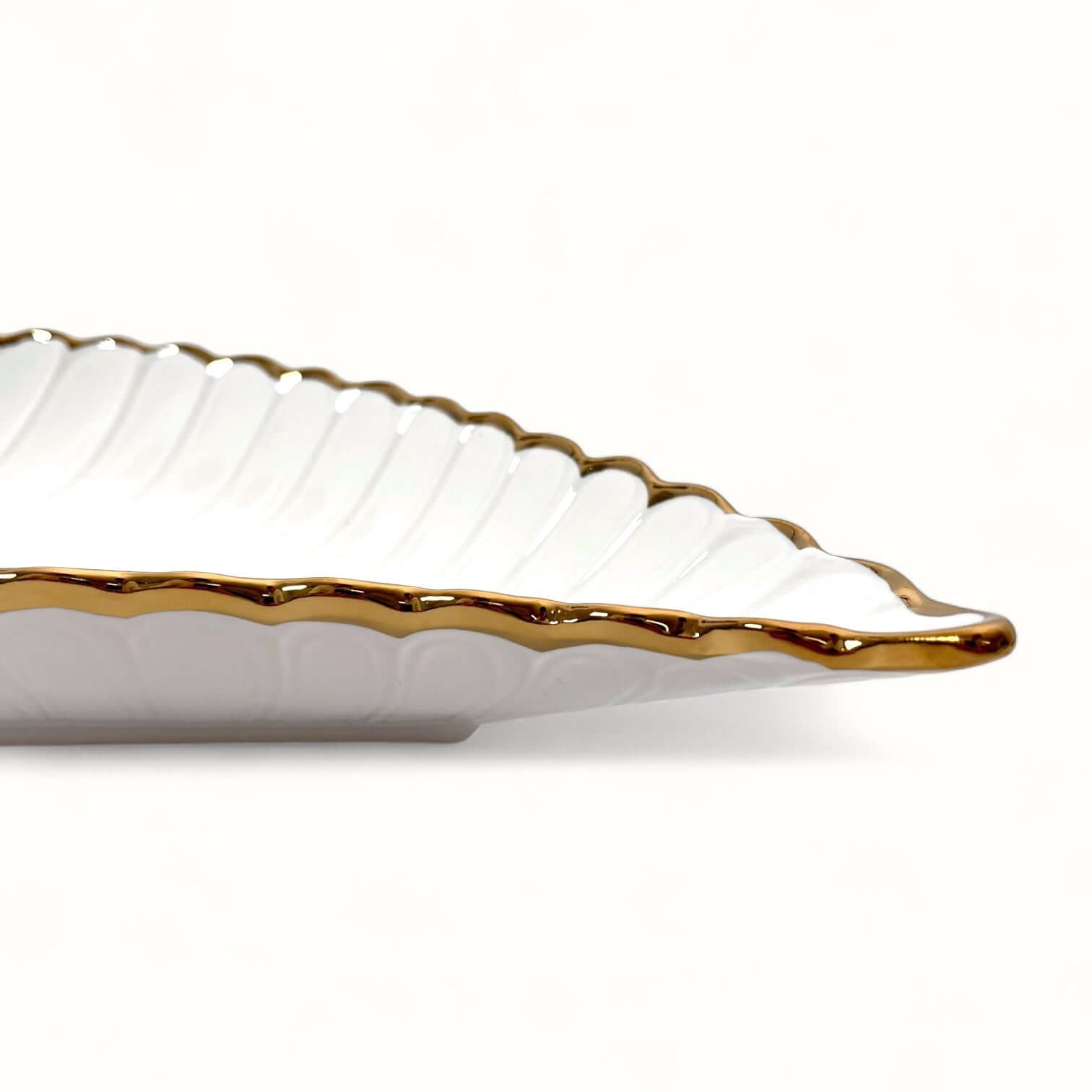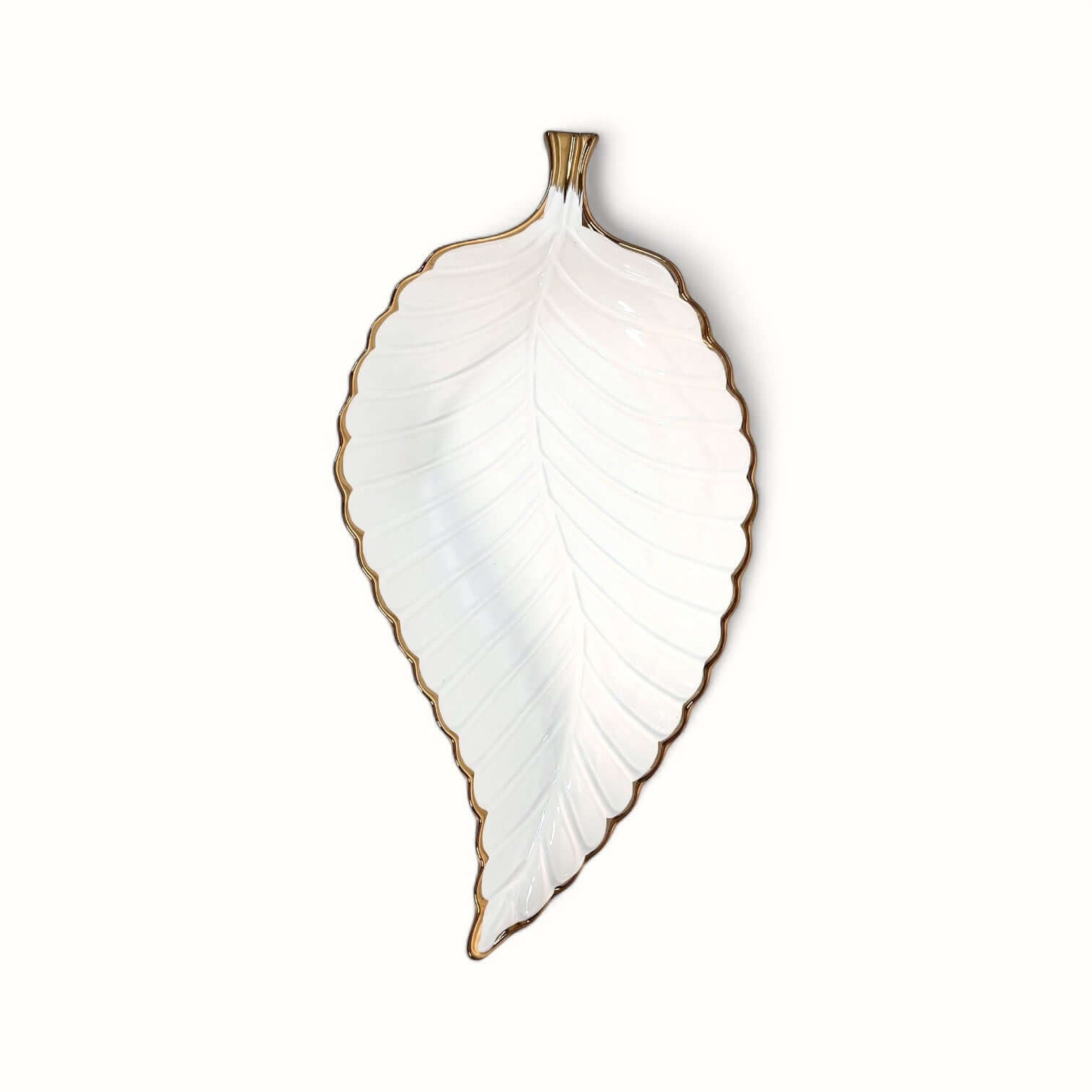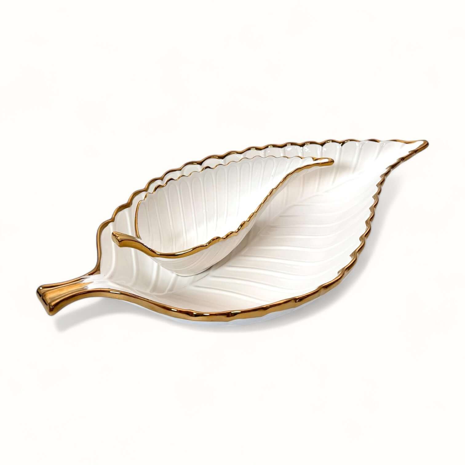 Vår skål i form av ett vitt löv med en strålande guldig kant är den mest eleganta och lyfter fram din mat med stil. Denna skål är inte bara praktisk, den är en smakfull dekoration i sig själv och ger en touch av lyx till din dukning. Gör din matupplevelse extraordinär med vår unika Lövformade skål.