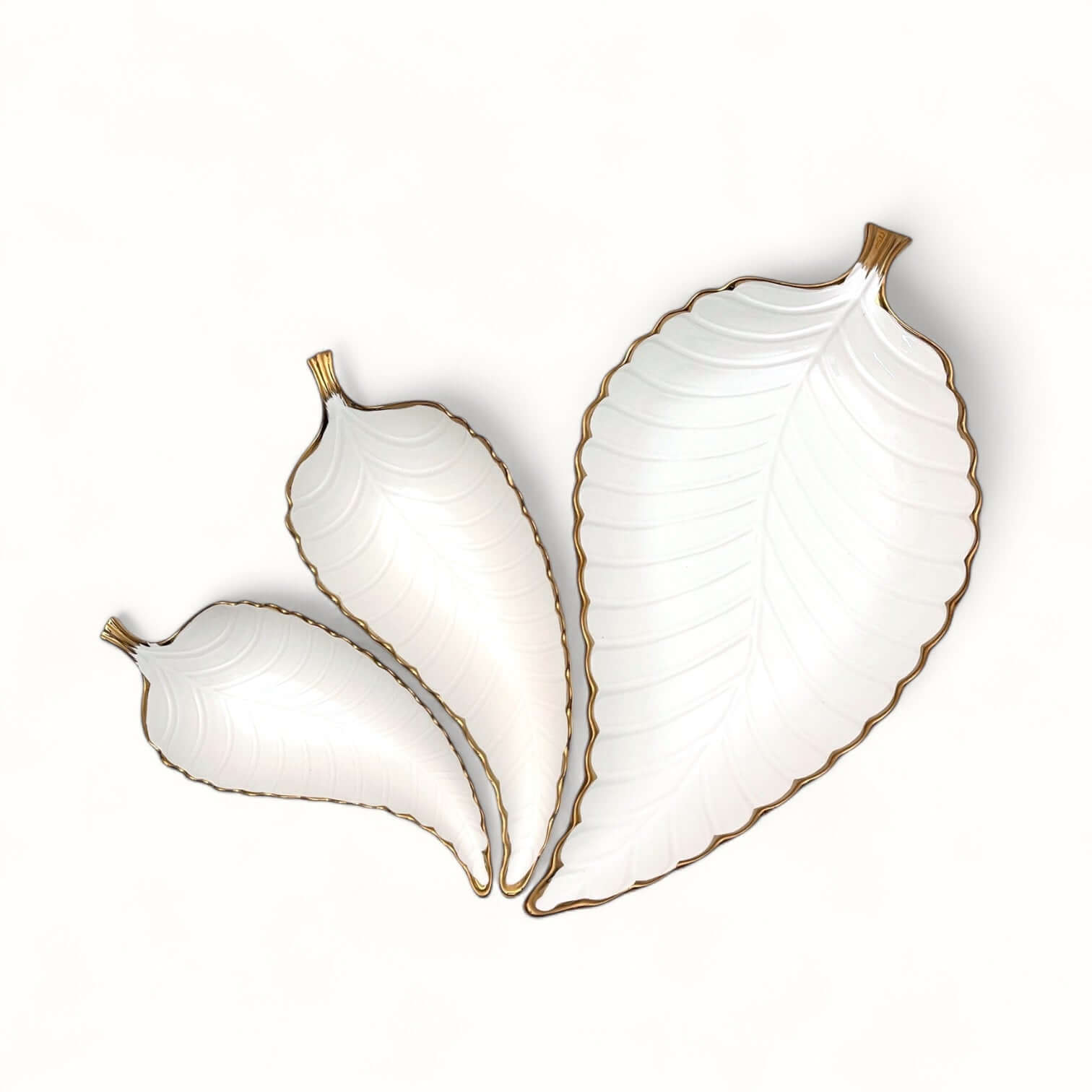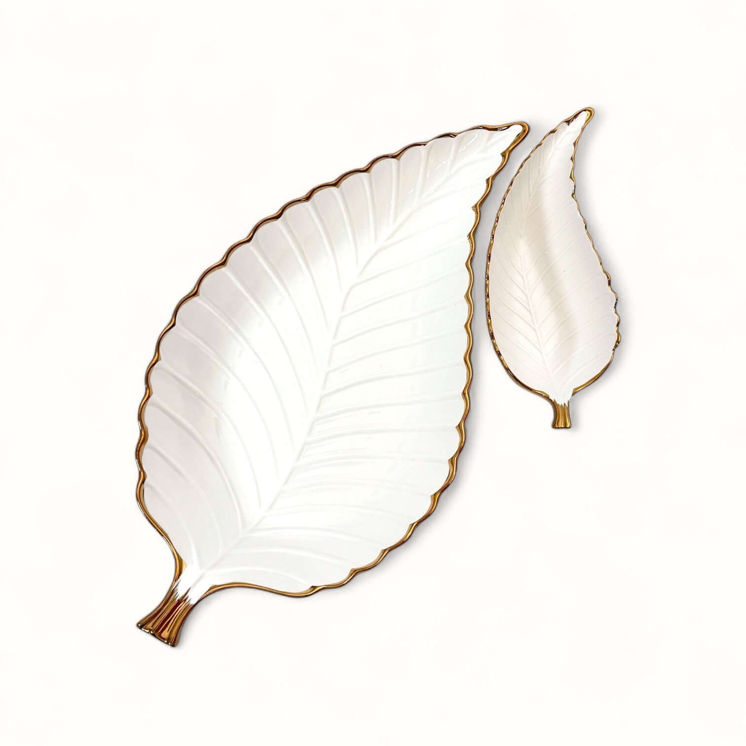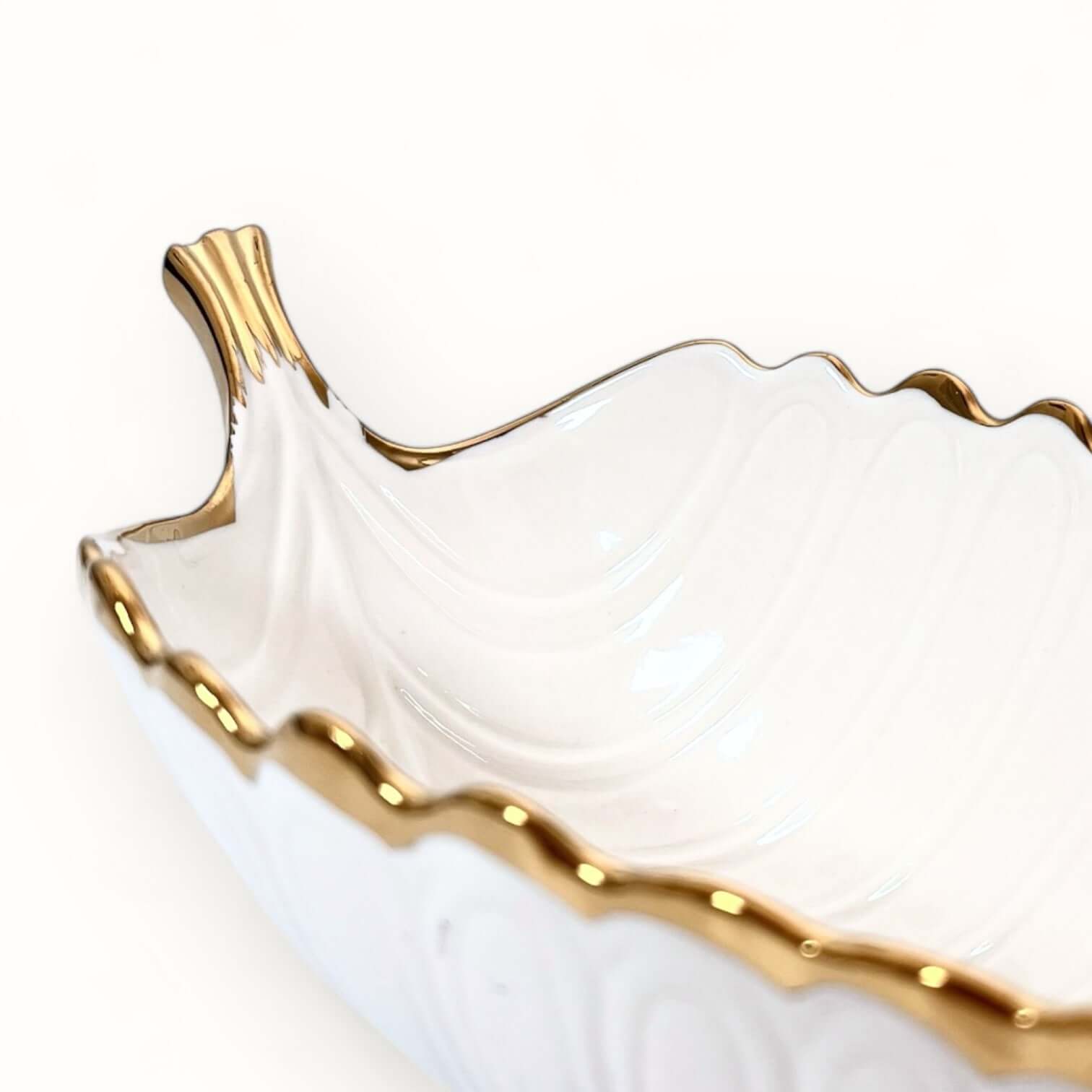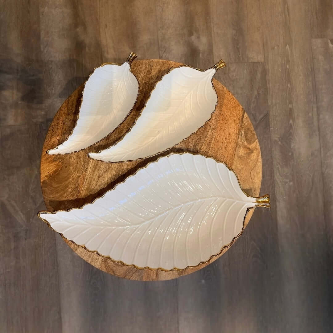 Vår skål i form av ett vitt löv med en strålande guldig kant är den mest eleganta och lyfter fram din mat med stil. Denna skål är inte bara praktisk, den är en smakfull dekoration i sig själv och ger en touch av lyx till din dukning. Gör din matupplevelse extraordinär med vår unika Lövformade skål.